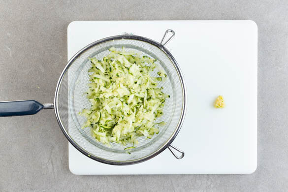 In einem großen Topf ausreichend gesalzenes Wasser für die Pasta zum Kochen bringen. Die Zucchini mit einer Küchenreibe grob raspeln und in ein Sieb geben, dann mit den Händen so viel Flüssigkeit wie möglich herausdrücken. Den Knoblauch schälen und fein reiben.