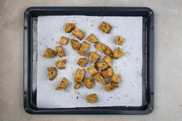 Die Brötchen grob würfeln und auf einem zweiten mit Backpapier ausgelegten Backblech mit 2EL Olivenöl, dem Sumach und je 1 Prise Salz und Pfeffer vermengen. Im Ofen in 6–8Min. knusprig backen, nach der Hälfte der Backzeit wenden.