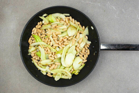 Den Fenchel in einer großen Pfanne mit 1EL Olivenöl bei mittlerer Hitze 5–7Min. braten, bis er anfängt, weich zu werden. Die Bohnen zufügen und 2–3Min. mitgaren. Die Pfanne vom Herd nehmen und das Gemüse mit Salz und Pfeffer abschmecken.