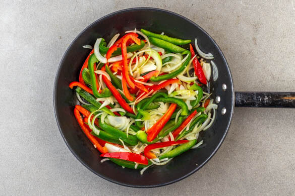 Das Hackfleisch in die Pfanne geben, mit je ½TL Salz und Pfeffer würzen und in 3–4Min. krümelig anbraten. Dann die Hitze erhöhen und in 5–7Min. weiterbraten, bis die Paprikastreifen weich werden.