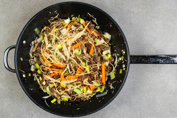 Das Hackfleisch in einer großen Pfanne mit 2EL Pflanzenöl bei starker Hitze ca. 2Min. scharf anbraten. Den Gemüsemix und den restlichen Knoblauch zugeben und bei mittlerer Hitze 5–7Min. unter häufigem Rühren mitbraten.