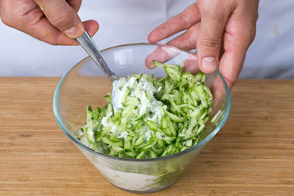 Die Gurke mit einer Küchenreibe grob raspeln und anschließend in einem Sieb gut abtropfen lassen. 2EL Joghurt in einem Schälchen beiseitestellen, den restlichen Joghurt mit der geriebenen Gurke vermischen und die Raita mit Salz und Pfeffer abschmecken.