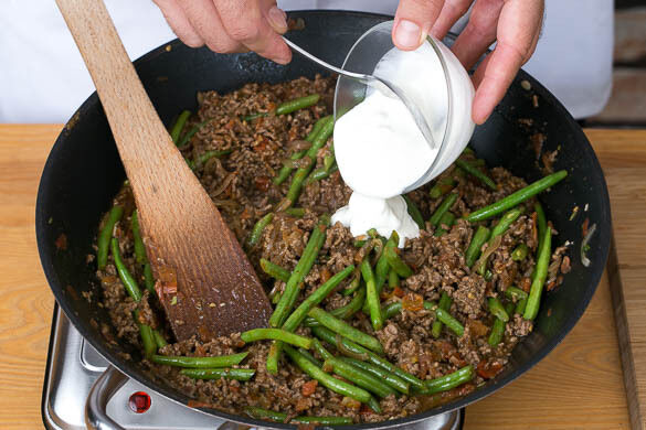 Das Hackfleisch zu den Zwiebeln geben und 3–5Min. mitbraten, bis es goldbraun angeröstet ist. Die Tomaten zugeben und mit 200ml Wasser ablöschen. Das Brühgewürz unterrühren, mit Salz und Pfeffer abschmecken und alles 3Min. köcheln lassen. Dann die Bohnen unterheben und ca. 7Min. mitgaren.