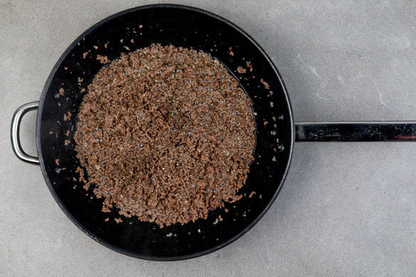 Das Hackfleisch in einer großen Pfanne mit 1EL Pflanzenöl bei starker Hitze 4–5Min. krümelig anbraten. Dabei gut rühren, damit das Hackfleisch schön knusprig wird.