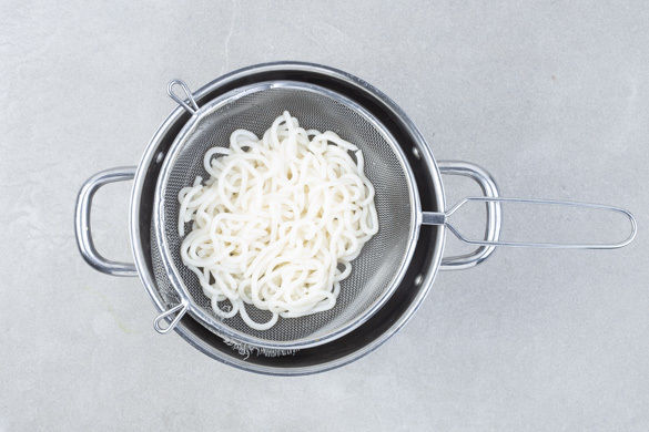 Die Nudeln in das kochende Wasser geben und 1–2Min. bei niedriger Hitze ziehen lassen. Dabei gut umrühren. In ein Sieb abgießen und abtropfen lassen.