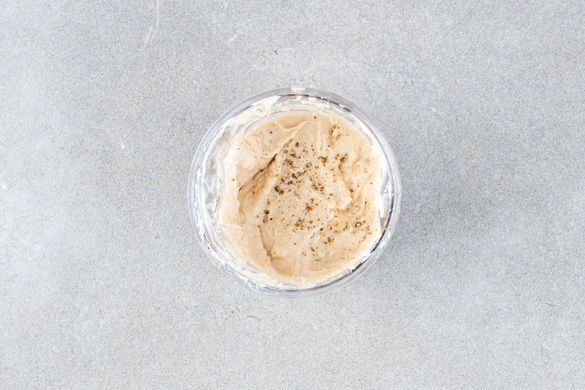 Die Bohnen in einem Sieb kalt abspülen und abtropfen lassen. Die Zitrone halbieren und auspressen. Die Bohnen in einem hohen Gefäß mit dem Tahini, 1EL Zitronensaft sowie je 2EL Olivenöl und Wasser mit einem Stabmixer fein pürieren. Mit Salz und Pfeffer abschmecken.