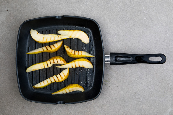 Die Birne längs vierteln und entkernen, dann die Birnenspalten mit ½EL Olivenöl einreiben. In einer Grillpfanne oder einer normalen Pfanne bei starker Hitze in 2–3Min. von jeder Seite goldbraun braten.