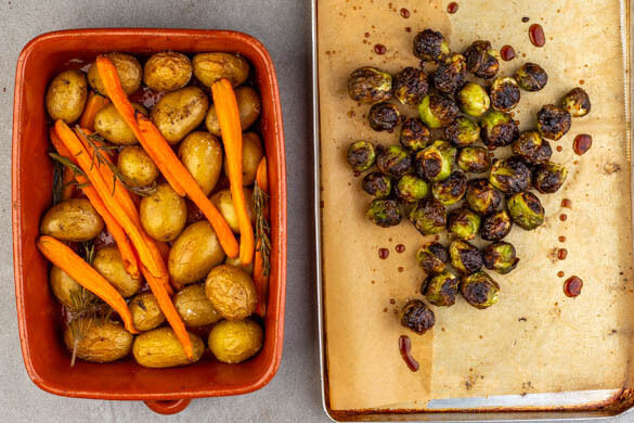 Das Ofengemüse ggf. wenden, um gleichmäßiges Garen sicherzustellen. Den Rosenkohl mit ½TL Balsamicoessig beträufeln. Die Karotten mit ½TL Honig und ½TL Olivenöl vermengen.