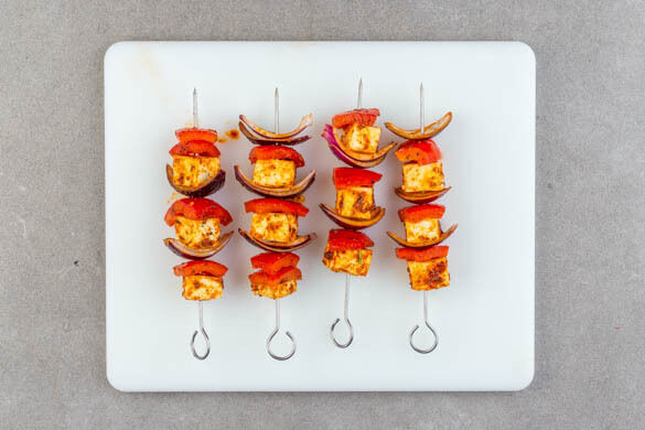 Die Spieße auf dem Grill oder in der Grillpfanne rundum 6–8Min. grillen oder bis das Gemüse gar ist. Vorsicht: Darauf achten, dass der Paneer nicht zu dunkel wird.