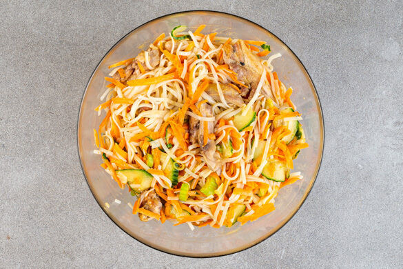 Das Fleisch und das angebratene Gemüse mit den Nudeln, den restlichen Karotten, der ½ der Gurkenscheiben und der Erdnusssauce vermengen.