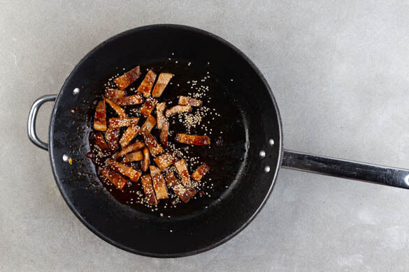 Das Fleisch aus der Pfanne nehmen und auf etwas Küchenkrepp abtropfen lassen, die Pfanne auswischen. Das Fleisch in ca. 1cm dicke Scheiben schneiden und zurück in die Pfanne geben. Mit der Würzsauce begießen und bei mittlerer Hitze 30Sek.–1Min. braten, bis die Sauce eingedickt ist, dann mit dem Sesam bestreuen.