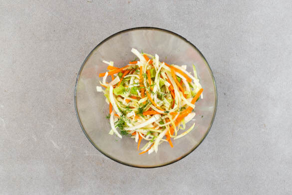 Die Karotte ggf. schälen und grob reiben. Die Lauchzwiebel in dünne Ringe schneiden. Den Weißkohl, die Karotten und die Lauchzwiebeln mit ½TL Zucker, ½TL Salz, 1TL Essig und 1 Prise Pfeffer verkneten, bis das Gemüse etwas weicher wird, dann 1EL Olivenöl untermischen.