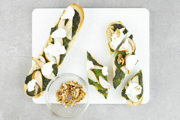 Wie gut, dass irgendwann mal jemand auf die grandiose Idee kam, süßes Obst mit herzhaften Speisen zu kombinieren – nicht auszudenken, was uns entgehen würde! Für diese knusprigen Baguettes dient ein würziges Pesto aus Spinat, Basilikum, Walnuss und Knoblauch als aromatisches Bett für saftige Birnenscheiben und weichen Ziegenfrischkäse. Dazu noch ein knackiger Salat aus zartem Babyspinat und vorgegarter Rote Bete – himmlisch!