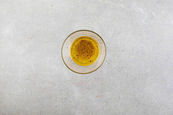 Aus 2EL Olivenöl, 2EL hellem Essig und je 1 kräftigen Prise Salz und Pfeffer ein Dressing anrühren.