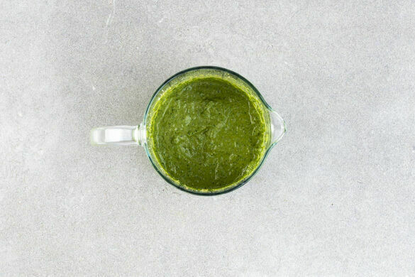 Den Backofen auf 220°C (200°C Umluft) vorheizen. Das Basilikum samt Stängeln grob schneiden. Den Knoblauch schälen und fein würfeln. Die ½ der Walnüsse mit 2 Handvoll Spinat, dem Basilikum, dem Knoblauch, 4EL Olivenöl, 3EL Wasser und je ½TL Salz und Pfeffer in einem hohen Gefäß zu einem glatten Pesto pürieren. Mit ggf. mehr Salz und Pfeffer abschmecken.