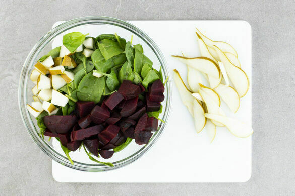 1 Birne halbieren, entkernen und der Länge nach in dünne Scheiben schneiden. Die andere Birne halbieren, entkernen und in kleine Würfel schneiden. Die Rote Bete in mundgerechte Stücke schneiden. Die Birnenwürfel mit der Roten Bete und dem restlichen Spinat vermengen.