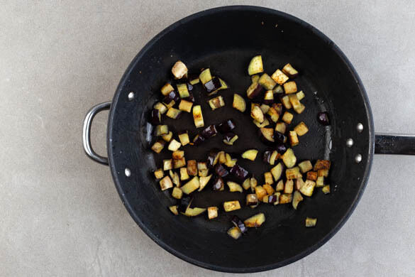 Die Aubergine in 1–2cm große Würfel schneiden und in einer mittelgroßen Pfanne oder einem Wok mit 2EL Pflanzenöl und 1 Prise Salz bei mittlerer Hitze in 5–7Min. rundum braun anbraten. Tipp: Zu Beginn des Bratvorgangs einige Spritzer Wasser auf die Auberginen geben, so werden sie schön zart.