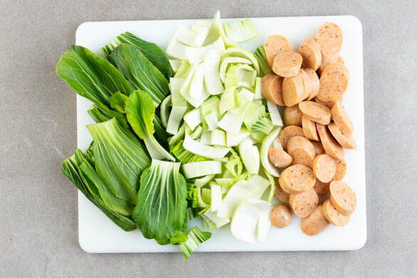 Die Würste in ca. 1cm dicke Scheiben schneiden. Den weißen und grünen Teil des Pak Choi separat in ca. 2cm breite Streifen schneiden.