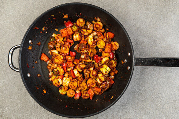 Den Knoblauch, die Chiliringe, die Korianderstängel, das Tomatenmark und die ½ der Gewürzmischung in einer großen Pfanne mit 2EL Olivenöl bei mittlerer Hitze ca. 1Min. anschwitzen. Den Gemüsemix dazugeben und in 5–7Min. weich braten.