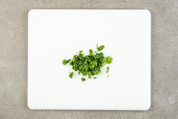 In einem mittelgroßen Topf 600ml leicht gesalzenes Wasser für den Reis zum Kochen bringen. Den Knoblauch schälen und fein würfeln. Die Chilischote in feine Ringe schneiden. Eine Limette halbieren und auspressen, die andere Limette in 4 Spalten schneiden. Die Korianderblätter von den Stängeln zupfen und die Stängel grob schneiden.