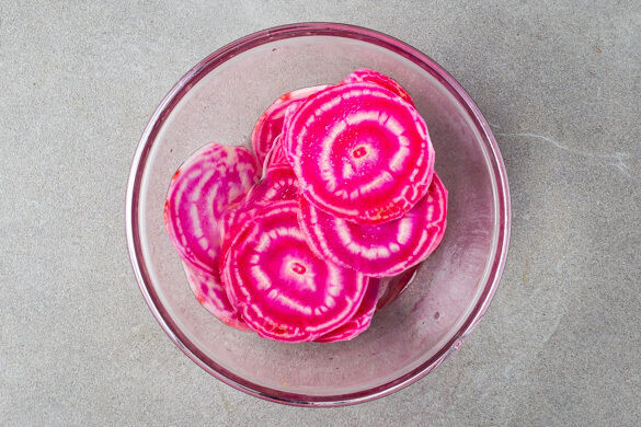 In einem kleinen Topf 300ml leicht gesalzenes Wasser für den Reis zum Kochen bringen. In einem zweiten Topf ausreichend Wasser für die Eier aufkochen. Die Chioggia-Bete schälen und in möglichst dünne Scheiben schneiden. 2EL Essig mit 1EL Wasser, 1TL Zucker und ½TL Salz verrühren, bis sich Zucker und Salz aufgelöst haben, dann die Bete-Scheiben untermengen.