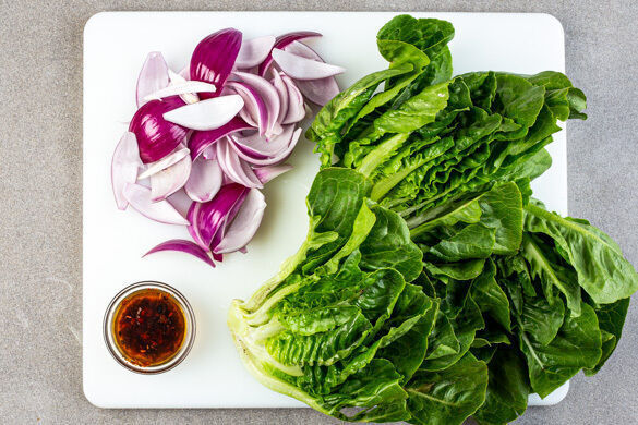 Ggf. den Grill anheizen. 1,5L Wasser in einem Wasserkocher aufkochen. Den Romanasalat jeweils längs halbieren. Die Zwiebel schälen, in 6 Spalten schneiden und die einzelnen Zwiebelschichten voneinander trennen. Die Chiliflocken in 2TL des aufgekochten Wassers einweichen.