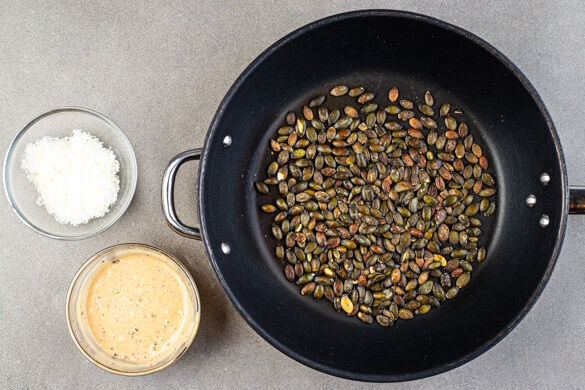 Die Kürbiskerne in einer mittelgroßen Pfanne ohne Zugabe von Fett bei mittlerer Hitze 2–4Min. anrösten, bis sie knistern und goldbraun sind. Zum Abkühlen aus der Pfanne nehmen. 4EL Mayonnaise, 2TL Honig und 2TL Essig mit den Chiliflocken samt Einweichwasser verrühren. Mit Salz, Pfeffer und ggf. mehr Essig abschmecken. Den Käse fein reiben.