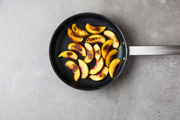 Die Nektarinen in derselben Pfanne ohne Zugabe von Fett 1–2Min. goldbraun anbraten, anschließend vom Herd nehmen.