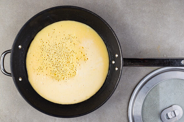 Je 1EL Butter in der Pfanne sowie einer weiteren großen Pfanne bei niedriger bis mittlerer Hitze schmelzen. Den Teig auf die beiden Pfannen verteilen und abgedeckt 6–8Min. ausbacken, dann die Deckel abnehmen und weiterbraten.