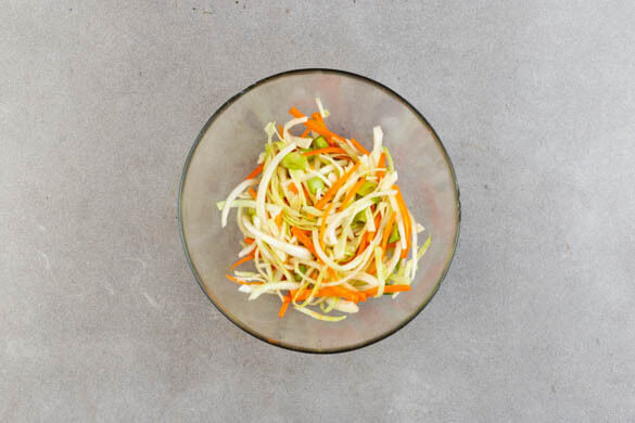 Die Karotte ggf. schälen und grob reiben. Die Lauchzwiebel in dünne Ringe schneiden. Den Weißkohl, die Karotten und die Lauchzwiebeln mit ½TL Zucker, ½TL Salz, 1TL Essig und 1 Prise Pfeffer verkneten, bis das Gemüse etwas weicher wird, dann 1EL Olivenöl untermischen.