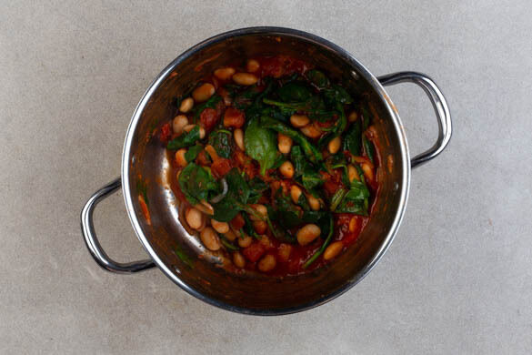 Die Zwiebeln in einem mittelgroßen Topf mit 1EL Olivenöl und 1 Prise Salz bei mittlerer bis starker Hitze ca. 1Min. anbraten, dann die Bohnen, die gehackten Tomaten und die Gewürzmischung unterheben. Den Spinat zugeben und alles abgedeckt 7–8Min. köcheln lassen.
