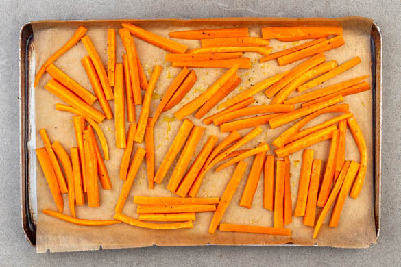 Den Backofen auf 240°C (220°C Umluft) vorheizen. Die Karotten ggf. schälen und in ca. 1cm dicke, pommesartige Stifte schneiden. Auf ein mit Backpapier ausgelegtes Backblech geben und mit 1½EL Olivenöl und je 1 Prise Salz und Pfeffer vermengen.