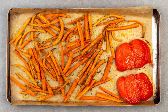 Das Backblech aus dem Ofen nehmen und die Karotten und die Paprika mit der Gewürzmischung vermengen.