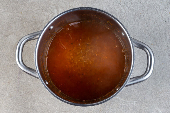 Mit 250ml Wasser ablöschen und die Mole 6–8Min. bei mittlerer Hitze einköcheln lassen. Mit einem Stabmixer im Topf sämig pürieren und die Mole ggf. mit etwas Wasser verdünnen, falls sie zu dickflüssig ist. Nach Geschmack mit etwas mehr Zimt, Kakao und Brühgewürz verfeinern und die Mole noch 2–3Min. unter Rühren köcheln lassen. Abgedeckt beiseitestellen.