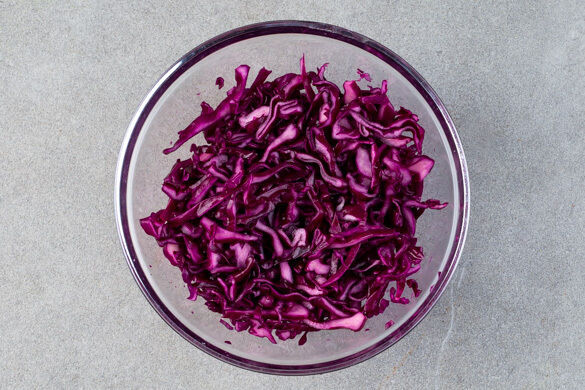 Den Rotkohl in feine Streifen schneiden und mit der ½ der Kapern vermengen. Für das Dressing den restlichen Knoblauch, die restlichen Kapern, den restlichen Zitronensaft, 2EL Senf und 6EL Olivenöl in einem hohen Gefäß mit einem Stabmixer zu einem cremigen Dressing pürieren. Mit Salz und Pfeffer abschmecken.