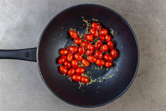 Den Knoblauch und das Zitronengras in den Wok oder die Pfanne geben und ca. 3Min. duftend weiterbraten, dabei häufig rühren. Dann die Kirschtomaten und 1EL Wasser unterrühren und abdeckt 5–7Min. garen, bis die Tomaten anfangen aufzuplatzen.