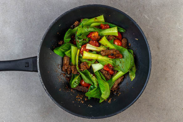 Inzwischen das Strunkende entfernen und die einzelnen Pak-Choi-Blätter voneinander trennen. Den Deckel abnehmen, die Hitze reduzieren und das Sambal Badjak, 1EL Ketchup, das Geschnetzelte und 200ml Wasser einrühren. Den Pak Choi zugeben und bei mittlerer Hitze abgedeckt 2–3Min. garen.