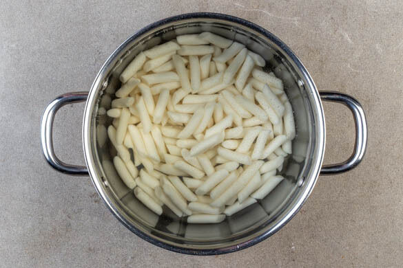 In einem mittelgroßen Topf ausreichend gesalzenes Wasser für die Reiskuchen zum Kochen bringen. Die Reiskuchen in einem Sieb abtropfen lassen, in das kochende Wasser geben und ca. 5Min. kochen. Dann erneut im Sieb abtropfen lassen und mit kaltem Wasser abspülen.
