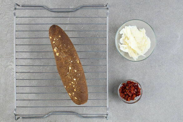 Die Brötchen auf einem Backrost 4–5Min. im Ofen aufbacken, anschließend etwas abkühlen lassen. Den Käse mit einem Sparschäler in breite Streifen schneiden. Die getrockneten Tomaten in kleine Stücke schneiden.