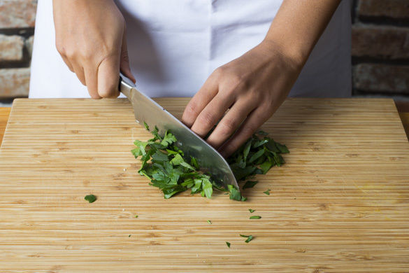 Die Petersilie samt Stängeln grob hacken. Das Chili nach Geschmack mit 1TL Kakao verfeinern und ggf. mit mehr Gewürzmischung sowie Salz und Pfeffer nachwürzen. Das Chili mit einem Klecks Joghurtdip anrichten und mit der Petersilie garnieren. Mit den Limettenspalten, den Käsebaguettes und dem restlichen Dip servieren.
