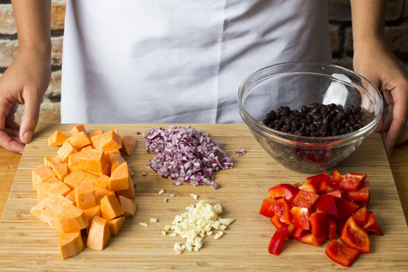 Den Backofen auf 200°C (180°C Umluft) vorheizen. Die Bohnen in einem Sieb mit kaltem Wasser abspülen und abtropfen lassen. Die Süßkartoffeln schälen und grob würfeln. Die Paprika halbieren, entkernen und in mundgerechte Stücke schneiden. Die Zwiebel und den Knoblauch schälen und fein würfeln.