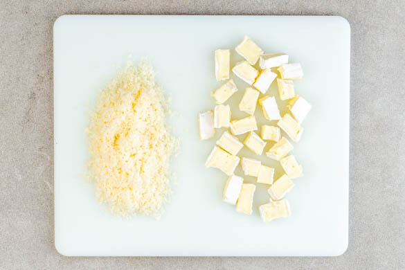 Den Brie in 2–3cm große Stücke schneiden. Den Hartkäse fein reiben.