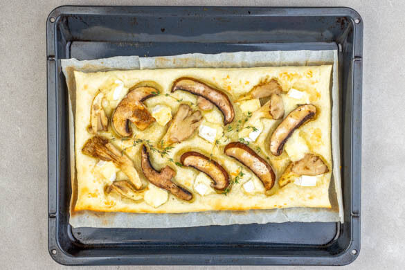 Die Teige mit dem Papier nach unten auf 2 Backblechen ausrollen. Die ½ des Bries und die ½ des Hartkäses darauf verteilen, dann mit der ½ der Pilze belegen. 10–15Min. im Ofen backen, dabei nach der Hälfte der Backzeit die ½ des Thymians über die Tartes streuen und die Position der Bleche tauschen. Den Vorgang mit den übrigen Teigen und Zutaten wiederholen.