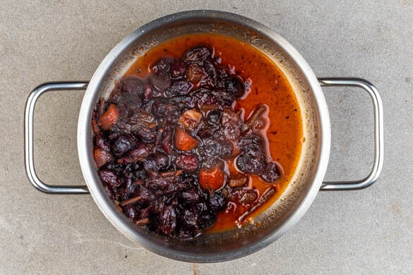 Die Cranberrys, die Datteln, 150ml Wasser, 4EL Balsamicoessig, 4EL Zucker und je 1 kräftige Prise Salz und Pfeffer in einen kleinen Topf geben und zum Kochen bringen. 5–6Min. köcheln lassen, bis das Chutney etwas eindickt, dann vom Herd nehmen.