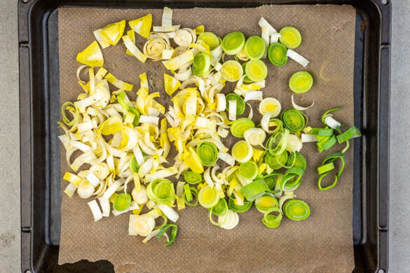 Den Backofen auf 230°C (210°C Umluft) vorheizen. Den Chicorée und den Lauch in ca. 0,5cm breite Ringe schneiden.