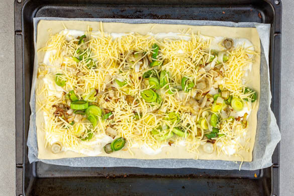 Den Chicorée und den Lauch mit dem Backpapier von den Blechen ziehen. Die Ofentemperatur auf 240°C (220°C Umluft) erhöhen. Die Teige mit dem Papier vorsichtig auf die Bleche ziehen und den Chicorée und den Lauch darauf verteilen. Mit dem Käse bestreuen und die Flammkuchen in 9–12Min. im Ofen goldbraun und knusprig backen.