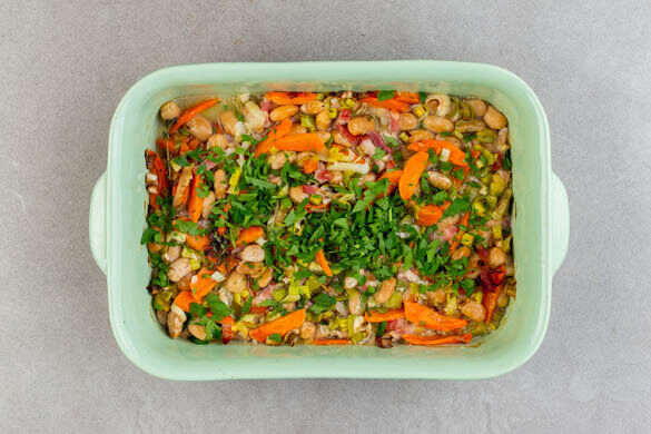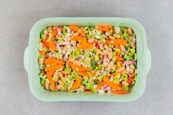 Die Bohnen in einer großen Auflaufform mit den Karotten, dem Lauch dem Knoblauch und dem Bacon vermengen, dann 100ml Wasser und die ½ des Brühgewürzes unterrühren.