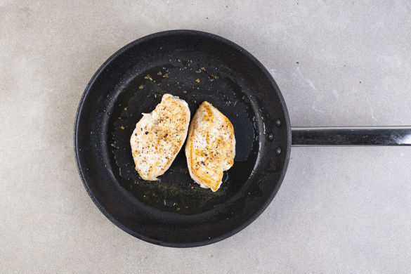 Das Fleisch trocken tupfen, horizontal halbieren und jeweils von beiden Seiten mit Salz und Pfeffer würzen. In einer großen ofenfesten Pfanne mit 1EL Olivenöl bei mittlerer bis starker Hitze auf jeder Seite ca. 1Min. scharf braten. Dann das Fleisch während der letzten 8–10Min. zum Gemüse in den Ofen geben und je nach Dicke nachgaren, bis das Fleisch durch ist.