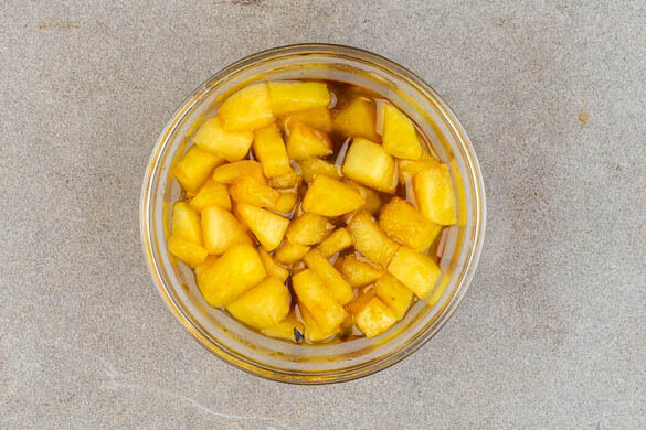 Den Apfel schälen, entkernen und in kleine Stücke schneiden. In einer mittelgroßen Pfanne mit 1EL Olivenöl bei starker Hitze 2–4Min. goldbraun anbraten, dann aus der Pfanne nehmen und mit 2TL Balsamicoessig, ½TL Zucker und 1 Prise Salz vermengen und beiseitestellen. Die Pfanne aufbewahren.