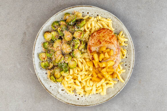Hausmannskost wie früher bei Oma gefällig? Dann haben wir genau das Richtige für dich: Die frischen Spätzle tauchen geschmeidig in eine würzig-cremige Zwiebelsauce ein und warten nur darauf, dass sich das saftige Rückensteak mit Apfel darüber breitmacht. Das Festmahl wird um Rosenkohl aus dem Ofen, garniert mit einer Käse-Semmelbrösel-Kombi, ergänzt. Da würde auch Oma glatt das Wasser im Mund zusammenlaufen!
